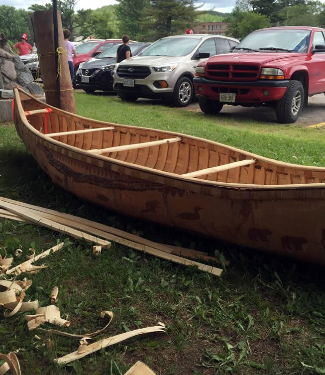 The canoe builds usually take two weeks to build from beginning to end, during this time visitors and community members are invited to visit and participate. There are smudges, potluck lunches, drumming, singing and socializing that takes place, the finale is the launching of the canoe. The first two canoe builds were in the Town of Bancroft, and last year it took place in Maynooth, Hastings Highlands.